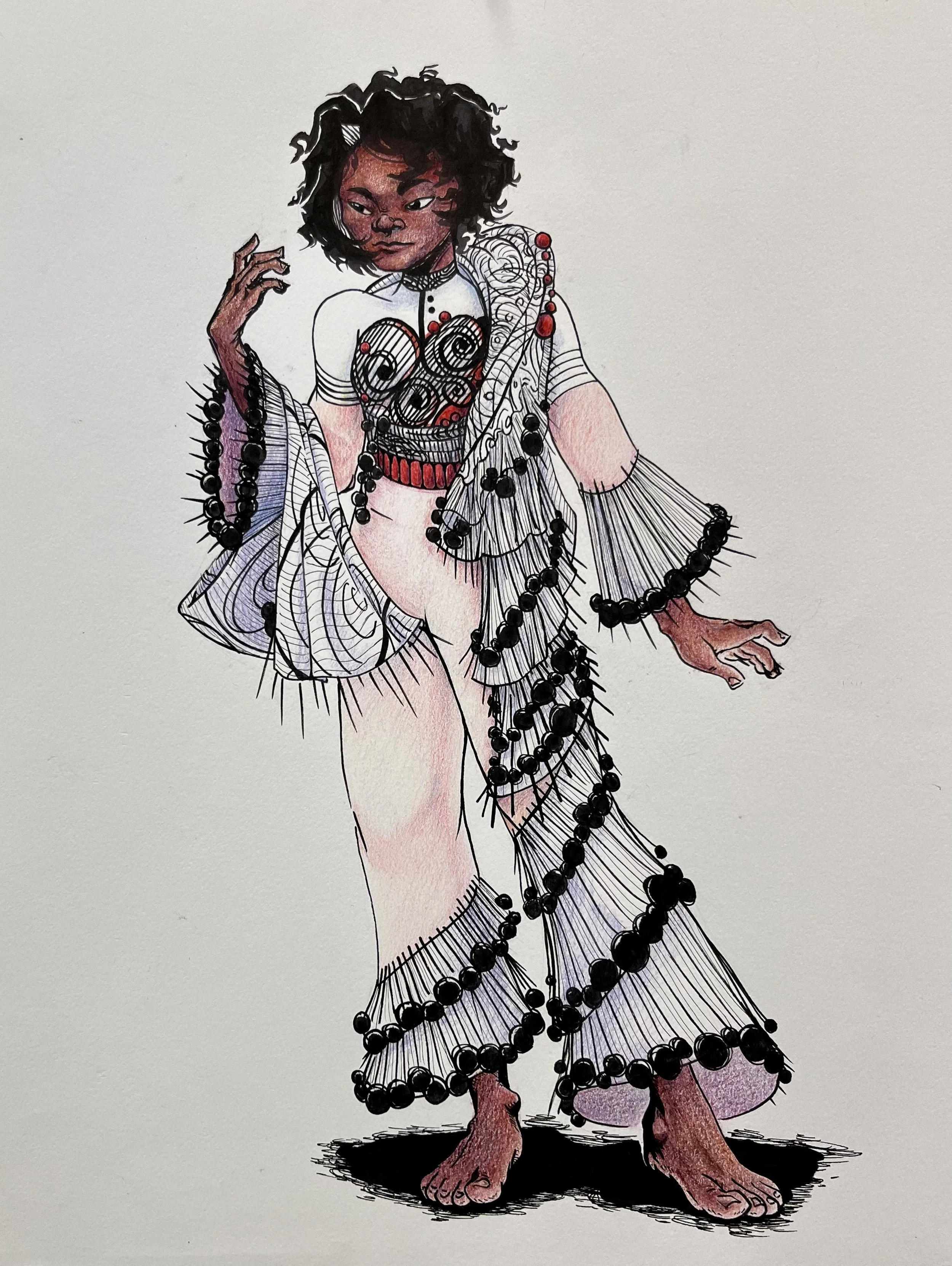 Ink brush, pen, and colored pencil on paper. 2023. A re-design of a Gianfranco Ferré illustration.