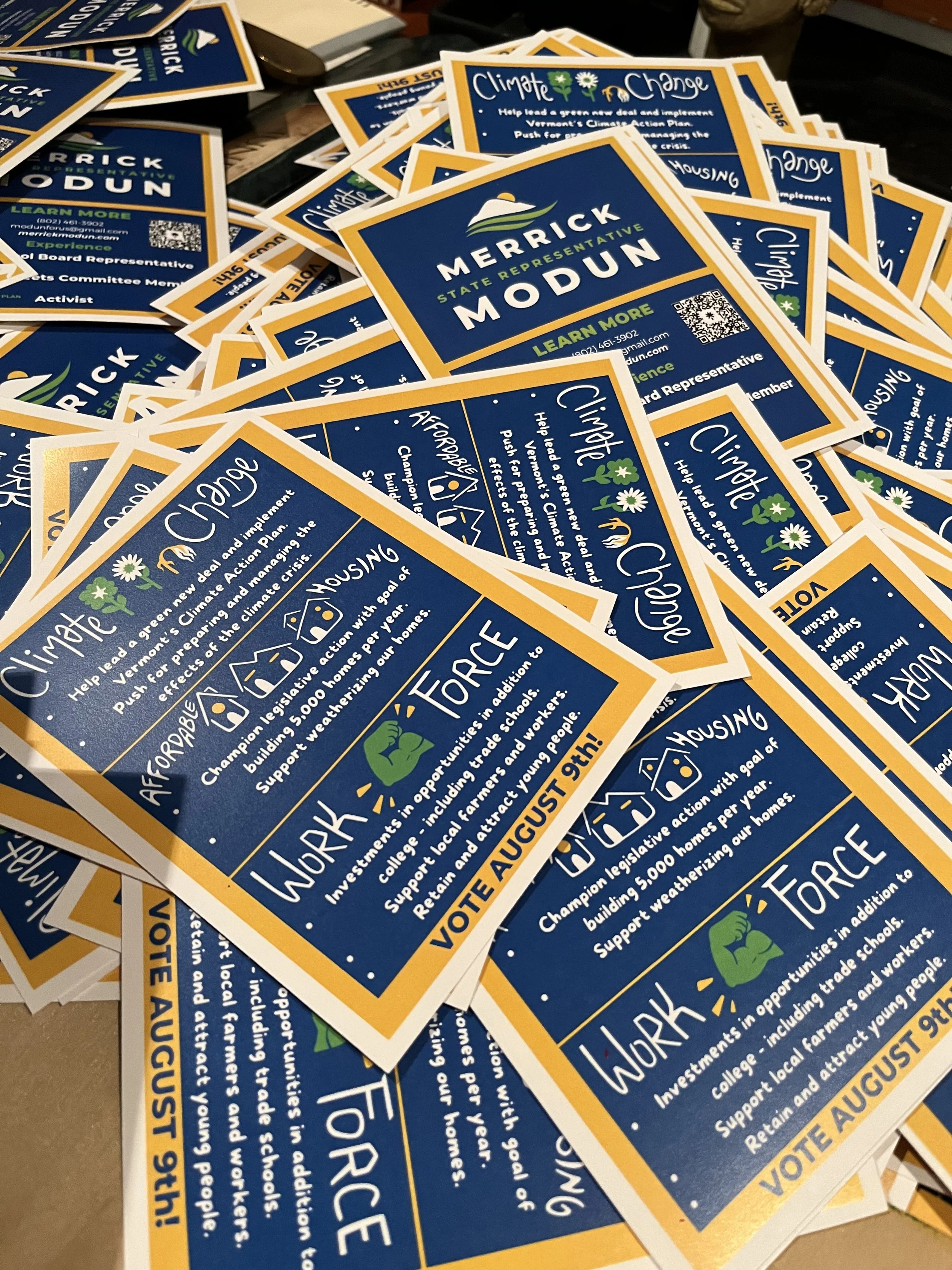 Merrick Modun’s 2022 campaign for Vermont State Representative. I made the issue-side icons and heading typography for Merrick’s campaign cards. Digital illustration.