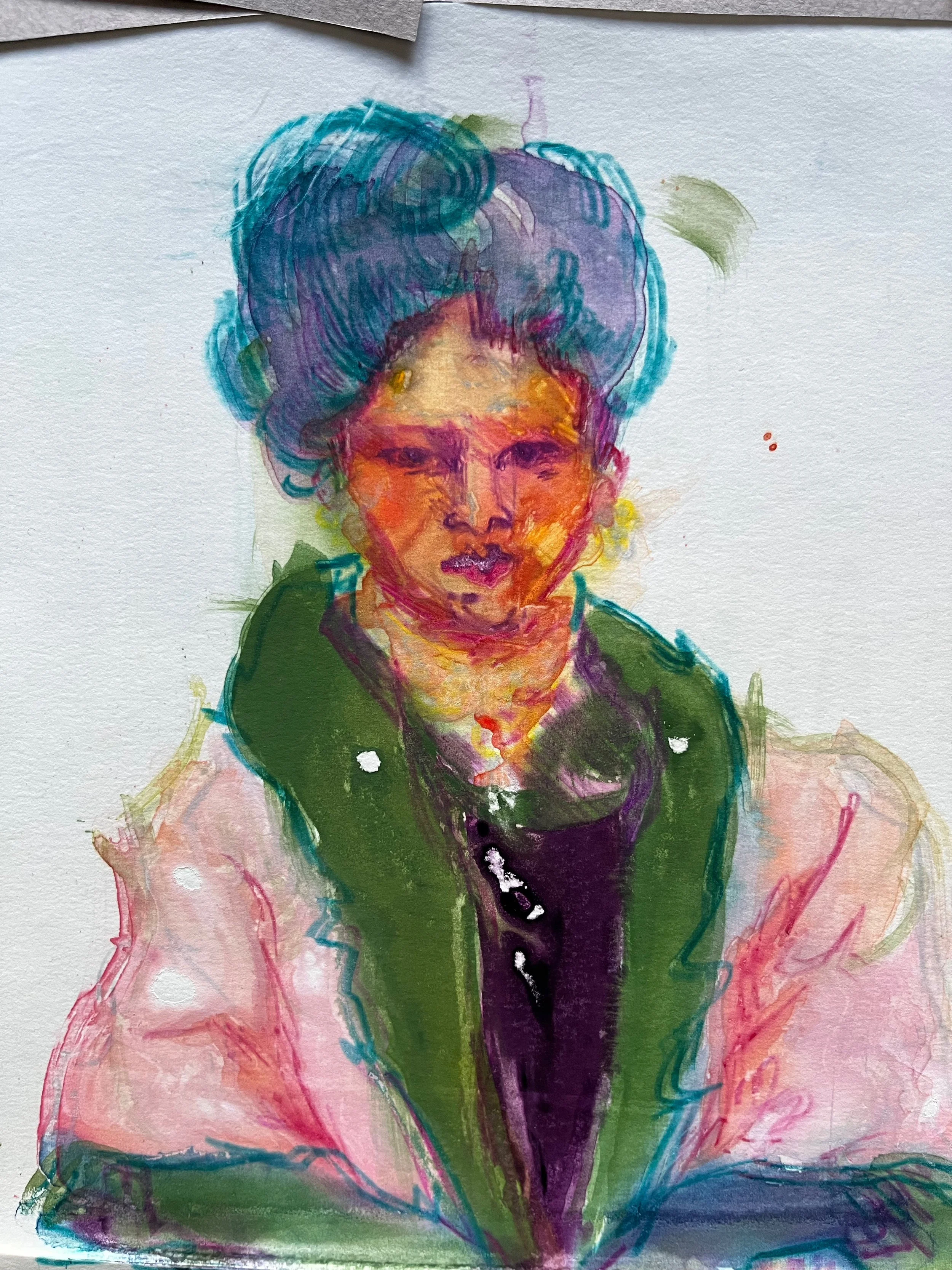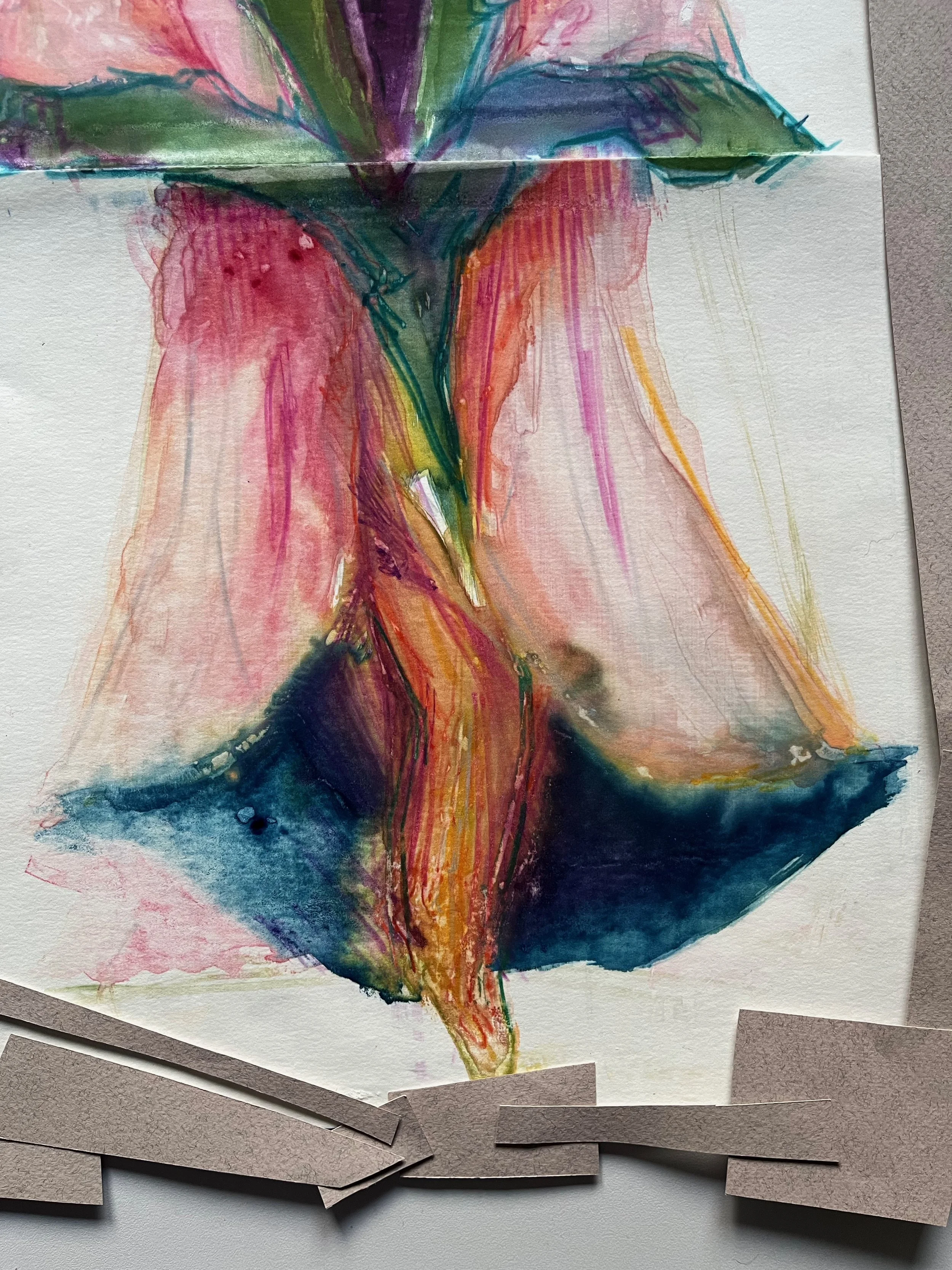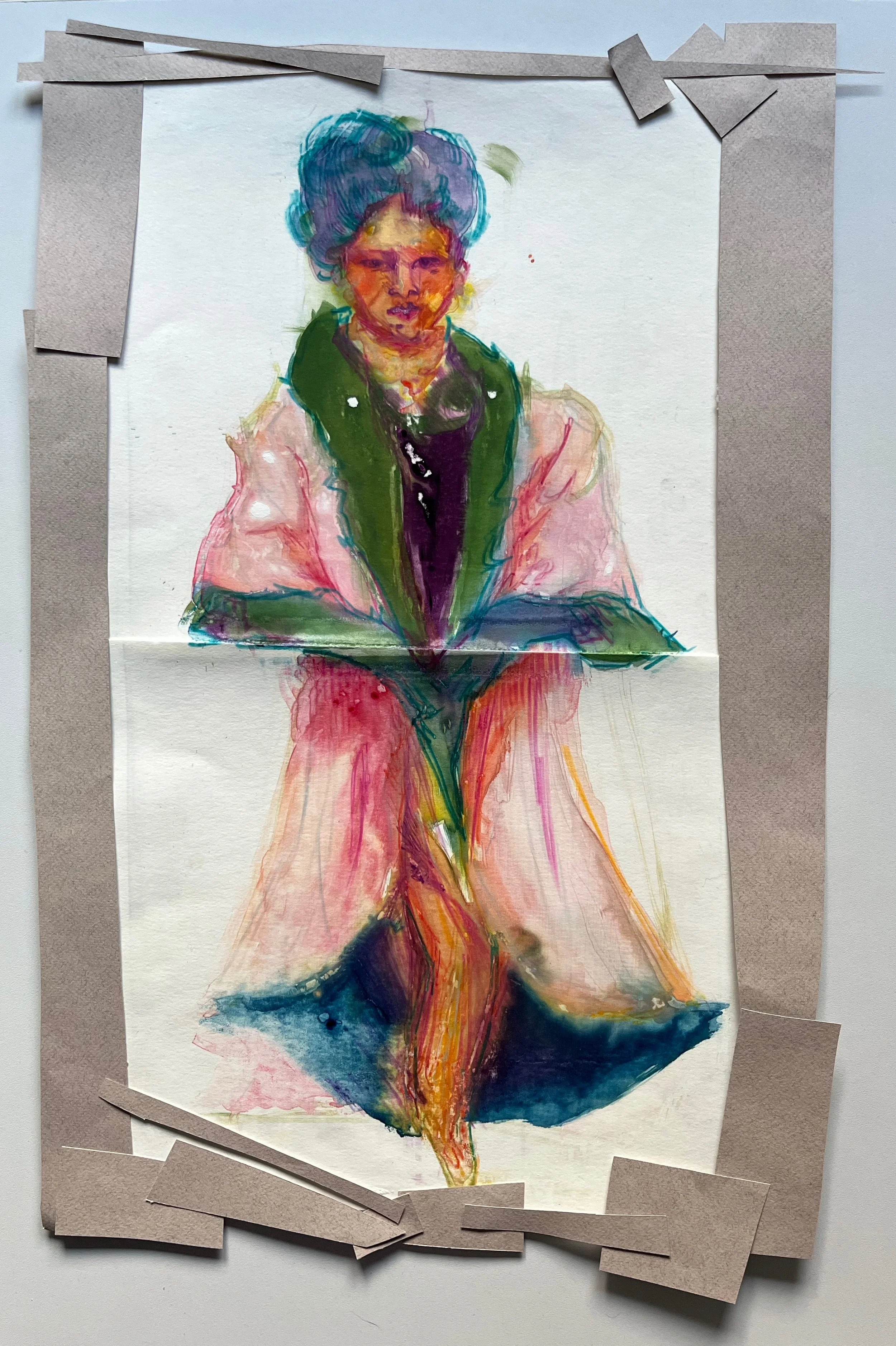 A screen mono-print, watercolor and water-soluble crayon on paper. With cut-out paper as border. 2023.